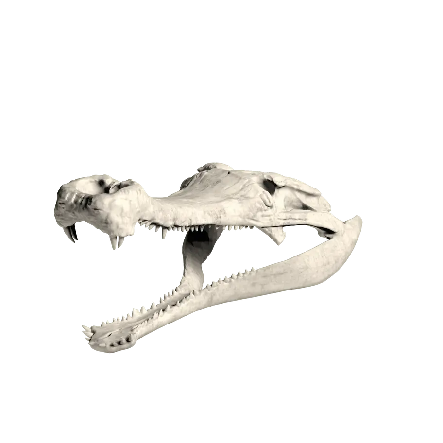 Sarcosuchus imperator, commonly known as "SuperCroc," is one of the largest crocodile-like reptiles to have ever lived, stretching up to 12 meters (40 feet) in length. Its skull alone could reach nearly 6 feet long and features a distinctively long, narrow snout filled with stout, conical teeth that did not interlock, perfect for gripping large fish and unwary dinosaurs. A unique feature of Sarcosuchus is the bulla—a massive, bulbous expansion at the very tip of the snout. This cavity likely served as a resonating chamber for vocalizations or a display structure to attract mates, distinguishing it from modern crocodiles.